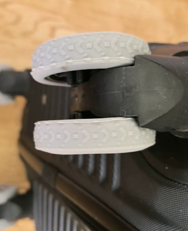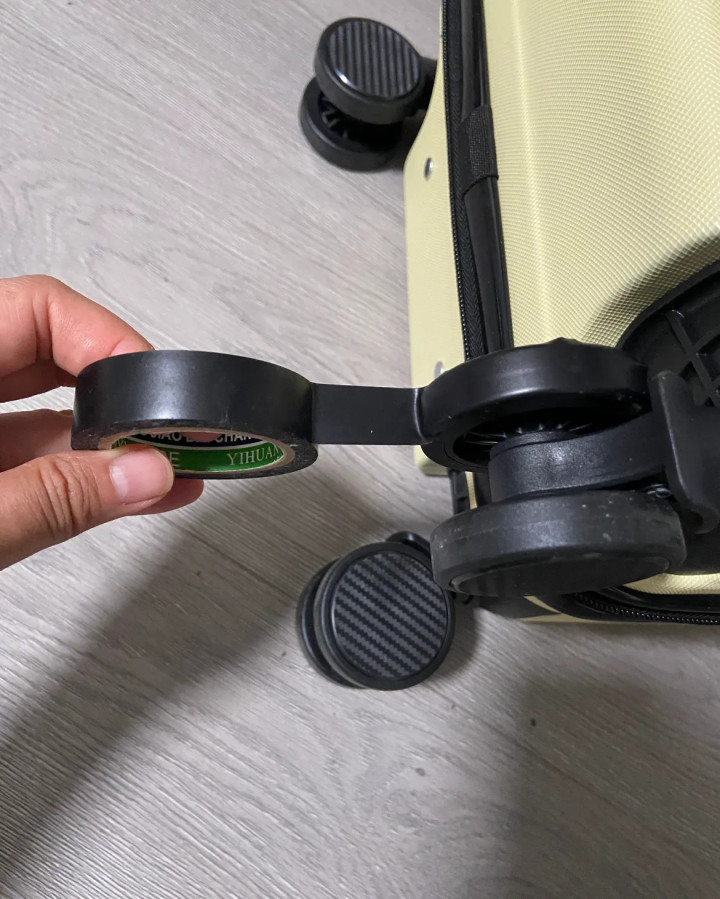 还不如绝缘胶带来得实在,出门前在轮子上多缠几圈,不费劲,薄软更贴合,摩擦力也比硅胶套好,防磨降噪一样能做到,回来撕掉,轮子都省的擦了。
